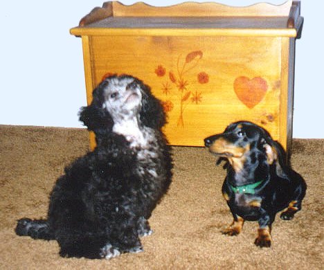 These are my puppies, Cricket and Spike. Cricket is a five-month-old miniature dachshund, and Spike is a three-month-old miniature poodle.