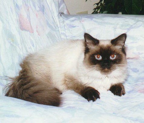 John Whitfield, DADS, Ekstrom Library This is Mister Rhett. He is a 2-1/2-year-old Seal Point Himalayan (CFA-registered). He is the foundation stud for the Bast-Shaman Cattery and has fathered 14 kittens to date and is also responsible for two expectant mothers. He lives with six other Himis: Angel Snowbird (Blue Point female), Destiny (Tortie Point female), Ramona (Seal Point female), Xu-Xu (Seal Point female), Lady Carnival (Tortie Point female), and Sugar Cookie (Flame Point male). Mister Rhett also owns John Whitfield and John's mate Jim. |