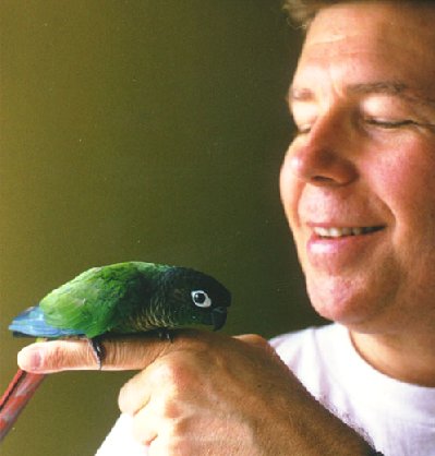 Rudi is a friendly Green-Cheeked Conure. She was hatched in Indiana where she learned the Hoosier way. (She loves corn.)