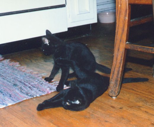 Amy & Mike Purcell Sparky and Babs were found in Cherokee Park by Gwen Snodgrass on the way to work at Kornhauser a few years ago. Mike and Amy fell in love (this time with the kittens) and adopted them. Recently Babs has run away. Probably to a household with less cats that serves canned cat food. Sparky is the only male animal in the house, with the possible (unknown) exception of Butthead the goldfish. |
